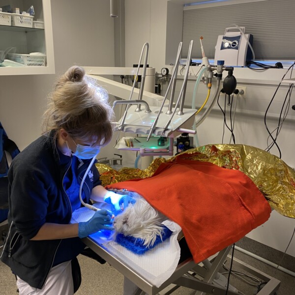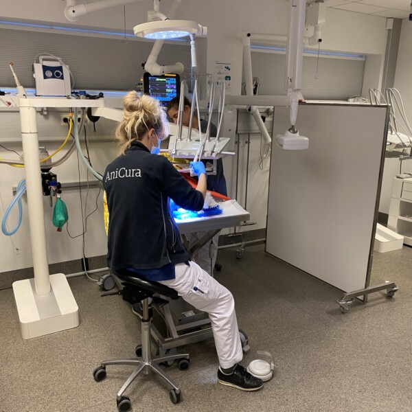 Forløbet starter typisk hos Lisette eller Louise, der står for tandrensning, måling af tandkødslommer og røntgen af tænderne. De laver den samlede vurdering og udarbejder behandlingsplan til ejerne. Når der skal foretages behandlinger som ekstraktioner eller fyldninger, overtager dyrlægerne.