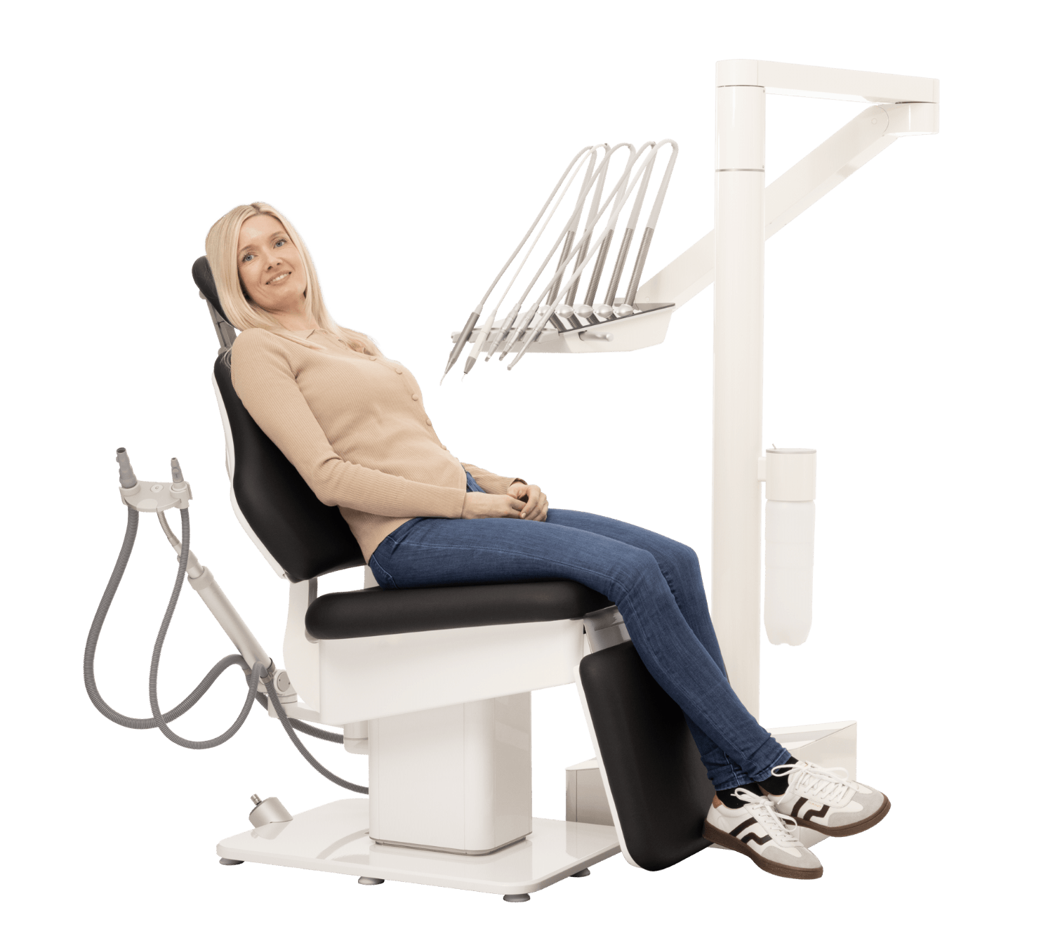 Når patienten overgår fra siddende til liggende stilling, bevæger stolen sig i en jævn, næsten flydende bevægelse, der er designet til at understøtte kroppens naturlige anatomi, især forholdet mellem ryg og nakke.